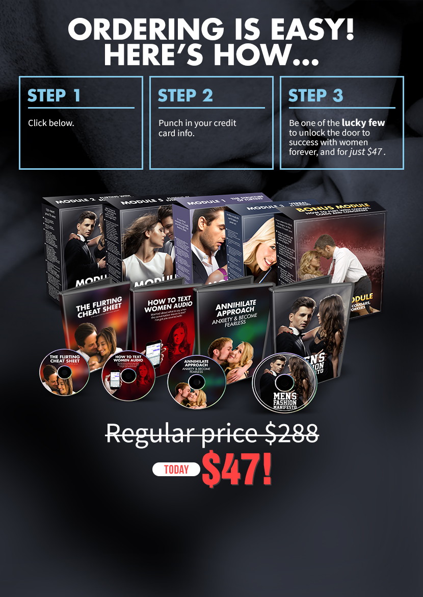 - And, a limited time bonus module chock full of my topsecret stealth methods for flirting (you really don’t want to miss this one).